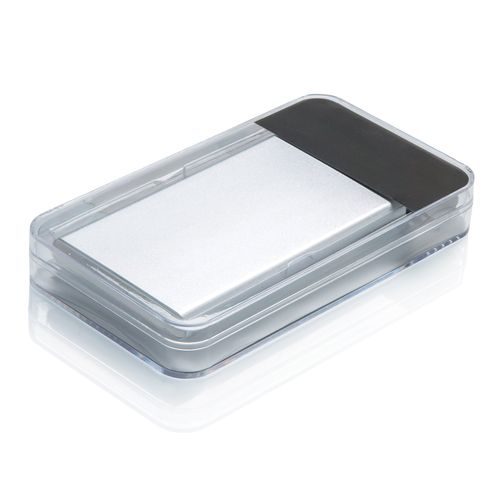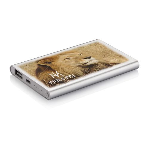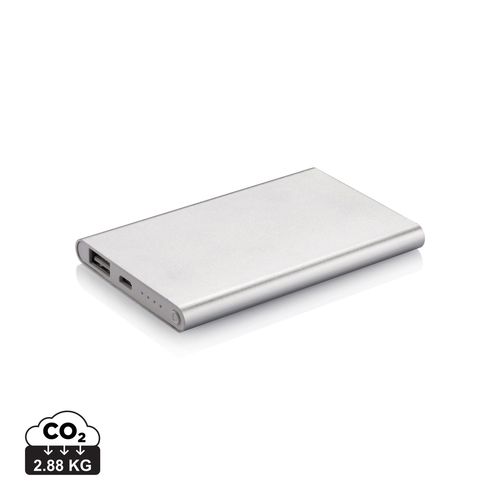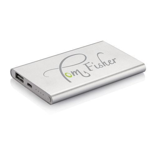 Powerbank 4000 mAh plate en aluminium avec batterie haut de gamme en polymère lithium. Avec bouton marche/arrêt et indicateur de la capacité restante. Sortie 5V/1A, entrée 5V/1 A. Avec câble Micro USB.