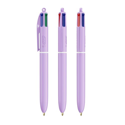 Découvrez le nouveau BIC® 4 Couleurs® Pastel ! Soyez créatifs avec les nouvelles couleurs pastel – pour des designs uniques avec un langage visuel de rêve ! Nos stylos à bille BIC® 4 Couleurs® ont une longueur d’écriture moyenne de 8 000 m (tests SGS – longueur d’écriture moyenne pour les encres bleue, noire, rouge et verte). Notre iconique BIC® 4 Colours® devient de plus en plus durable, avec désormais 13% de plastique en moins dans la partie supérieure !