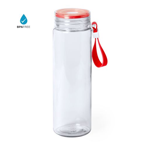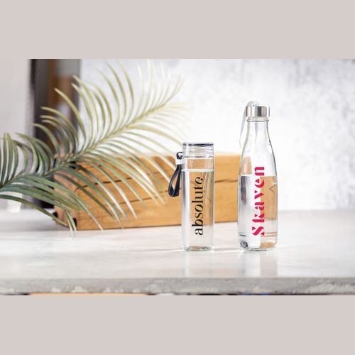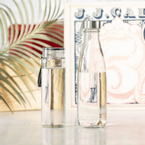 Bouteille en verre de 420 ml. Gourde de corps transparent et des détails de couleurs au niveau du bouchon et de sangle. Bouchon à vis sans BPA et anse de transport réglable assortie. Présenté dans une boîte design.