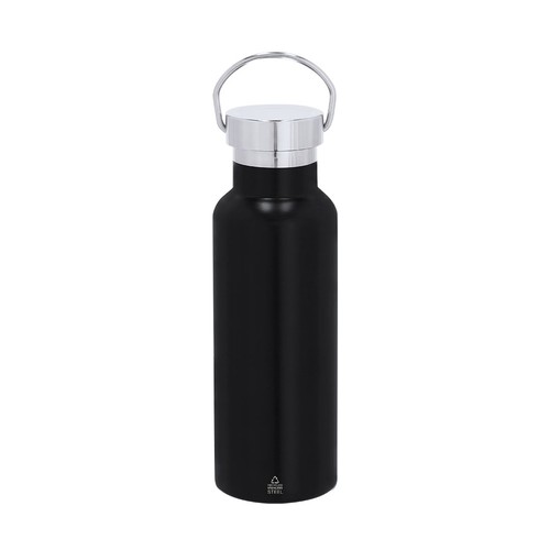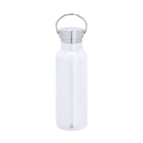 Gourde thermo en Acier Inox Recyclé de 500 ml de capacité. Avec double paroi pour une meilleure et plus durable conservation de la température et un intérieur revêtu de céramique, adapté aux boissons gazeuses. Bouchon à vis avec solide anse de transport en acier poli. Avec distinction Acier Inox Recyclé.L’acier est l’un des matériaux les plus demandés et se trouve presque partout, des produits d’usage quotidien aux grandes constructions. Avec d’innombrables propriétés, parmi lesquelles on peut souligner la durabilité et son haut degré de réutilisation, ce qui en fait une alternative très prisée dans les solutions de durabilité. Convenablement traité, il permet d’obtenir de nouvelles ressources d’utilisation infinie.