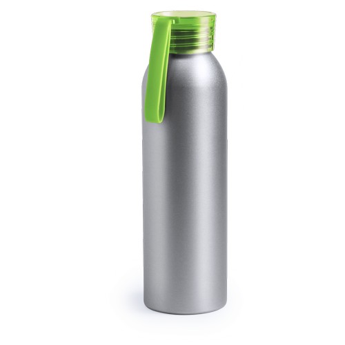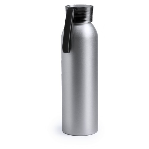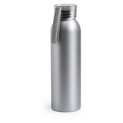 Bidon en aluminium de 650 ml de capacité. Corps en couleur argentée, avec bouchon de sécurité à vis dans une gamme variée de couleurs transparentes. Ruban de transport en matériau TPR assorti.