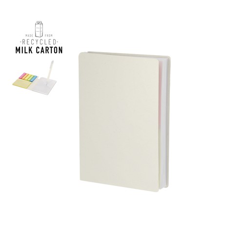 Bloc-notes en carton de lait recyclé avec notes autocollantes. Inclut :- Stylo assorti inclus, à encre bleue.- Support intégré pour le stylo.- Bloc avec 50 feuilles de couleur blanche.- Notes autocollantes moyennes et mini notes autocollantes en plusieurs couleurs. Inclut symboles Recycled Milk Carton. Les cartons de lait sont majoritairement composés de carton et d’aluminium. Lors de leur processus de recyclage, les différents matériaux de l’emballage sont séparés pour leur réutilisation, contribuant ainsi à emprunter le chemin infini de l’économie circulaire. Ce matériau est caractérisé par son haut degré de recyclabilité, ainsi que par sa légèreté et sa résistance.