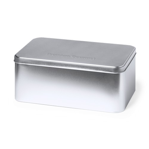 Boîte de présentation au format rectangulaire, en métal résistant avec une finition argentée et un couvercle assorti.
