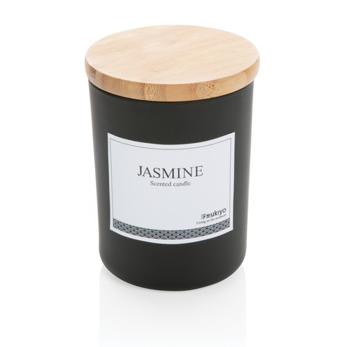 Bougie parfumée Ukiyo présentée dans un pot élégant avec un couvercle en bambou. Parfum de jasmin pour créer de la chaleur et du confort dans votre maison.