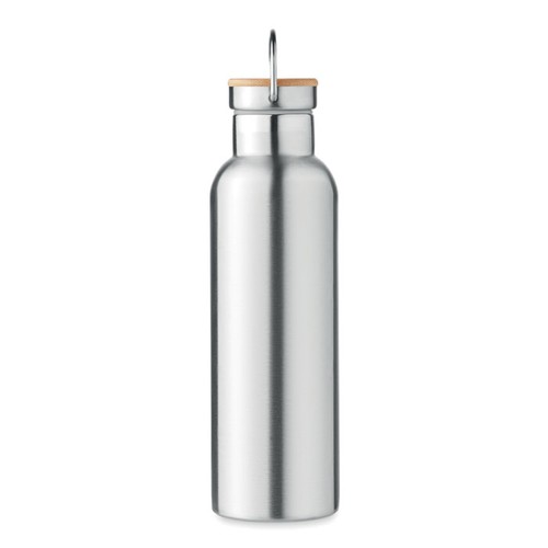 Bouteille à vide isolant à double paroi en acier inoxydable avec couvercle en bambou et poignée de transport. Capacité : 750 ml. Anti fuite. Le bambou est un produit naturel, et présente de légères variations de couleur, de décoration et de tailles.