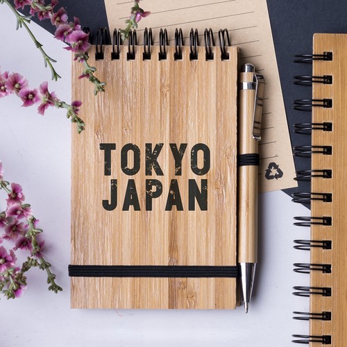 Carnet anneaux, avec couverture rigide en bambou et stylo assortie en bambou. Taille compact avec élastique de couleur noire, produit élégant. 70 feuilles lignées, Design Eco. Stylo cartouche jumbo et encre bleue.