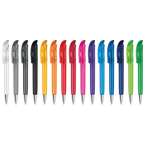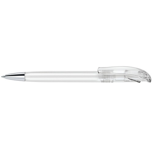 Stylo à bille rétractable avec corps en plastique transparent et pointe en métal.
