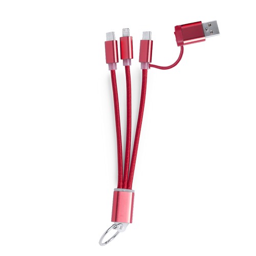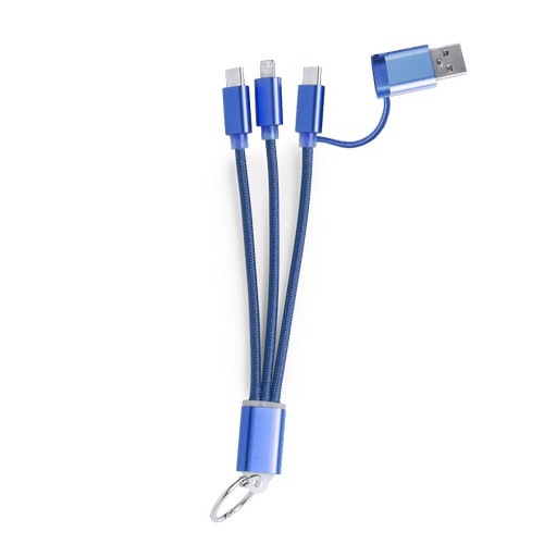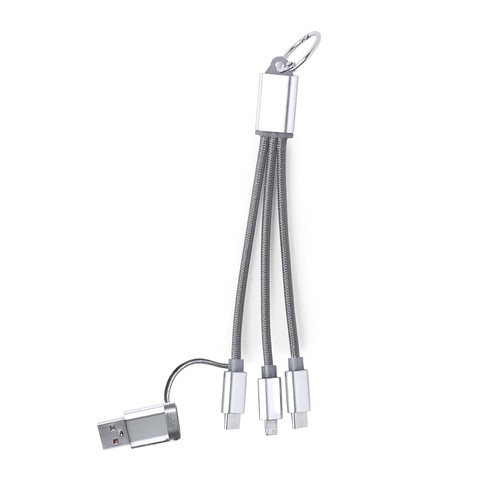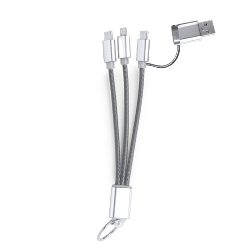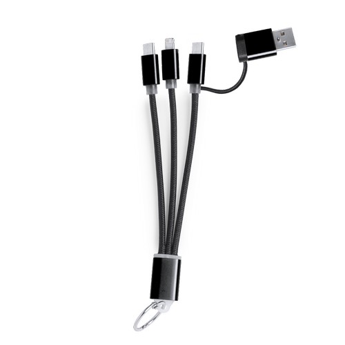 Câble de chargeur avec double connexion micro USB / Lightning et type C (entrée et sortie). Connecteurs en aluminium et en tôle spécialement conçus pour le marquage laser.