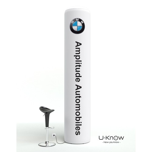 Nouvelle colonne / totem avec gonfleur intégré de hauteur 300cm et de diamètre 60cm. Une pompe de gonflage et de dégonflage de 150 Watts est intégrée au plateau bas de la structure. La colonne est livrée entièrement montée : vous n’avez qu’à appuyer sur le bouton pour gonfler votre produit. Un branchement électrique est nécessaire pour le montage de la colonne. Une fois la colonne gonflée, le câble se range à l’intérieur de la structure et il n’est plus nécessaire d’avoir une source de courant. Le visuel est imprimé en sublimation sur une toile polyester en allover et est monté à son extrémité avec un joint en silicone pour fixer la toile au plateau inférieur. Utilisation intérieure exclusivement..Structure disponible sur stock dans notre entrepôt parisien, impression réalisée après validation de la commande