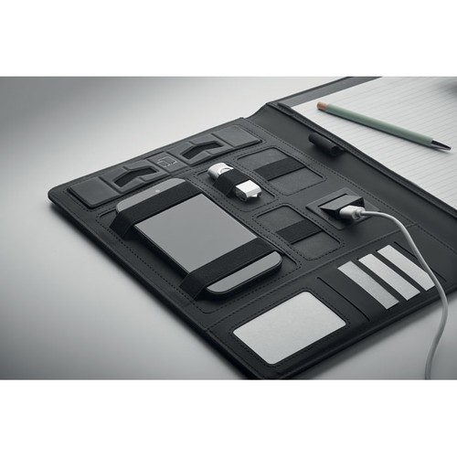 Conférencier A4 avec couverture en polyuréthane. Power bank de 5000 mAh et chargeur magnétique sans fil de 15W. bloc-notes de 20 feuilles lignées. Plusieurs compartiments internes. Fermeture magnétique. Porte-stylo élastique.