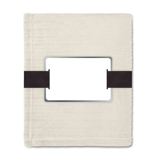 Couverture souple en polaire de 240 gr/m² enveloppée dans un ruban et carte imprimable.