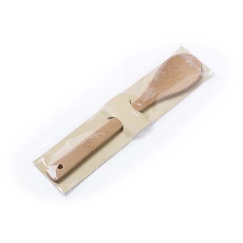 Cuillère de cuisine en bambou. Présentée en sachet individuel avec renfort en carton.