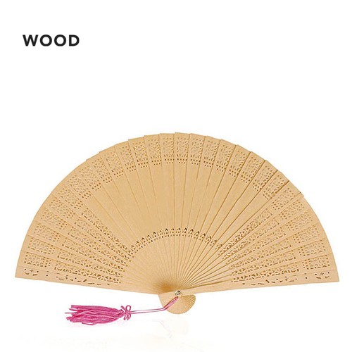 Eventail en bois naturel ajouré avec ruban à pompon. Présenté dans une boîte individuelle.