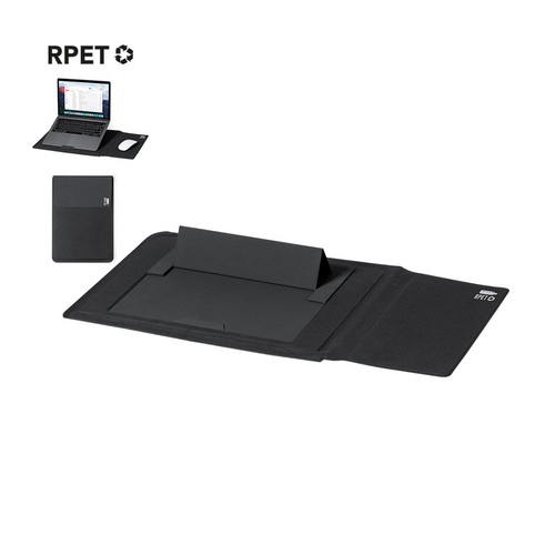 Boîtier d’ordinateur en polyester 600D RPET, fabriqué à partir de plastique recyclé, afin d’encourager la réutilisation des déchets plastiques et d’aider à la durabilité de la planète. Avec fermeture magnétique et badge RPET. Intérieur rabattable avec tapis de souris et support d’ordinateur incliné. Présenté dans une boîte design individuelle.