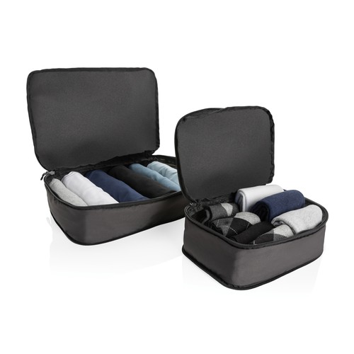 Set de 2 housses de rangement, fabriqués en 100% RPET, qui peuvent s’étendre et se comprimer pour optimiser l’espace d’emballage, peut vous aider à faire vos valises de manière plus efficace et à rester organisé. Le petit cube mesure L25*L18*H10 cm et a un volume de 4,5 litres. Le grand cube mesure L36*L25*10 cm et a un volume de 9L. Taille à plat 3cm et expansion jusqu’à 10cm. Avec le traceur AWARE™ qui valide l’utilisation authentique de polyester recyclé.