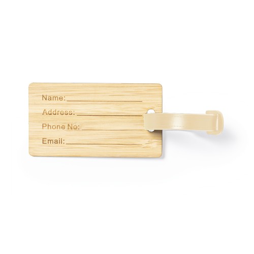 Identifiant pour valises de la ligne nature en bambou. Ruban de fixation avec fermeture à boucle et données d’identification en anglais, avec côté opposé lisse pour le marquage.