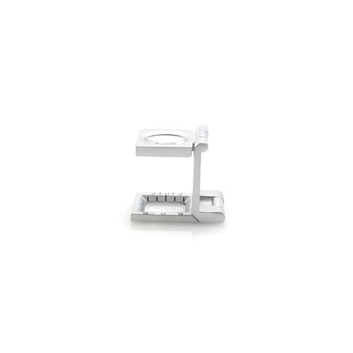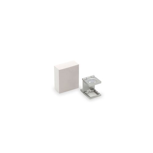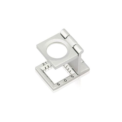 Loupe compte-fils pliante en métal avec grossissement de 10X.Avec lentille en verre et règle de mesure intégrée dans le corps. Présentée en boîte individuelle.