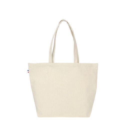 Sac de plage Marine écru certifié(e) GOTS, dimensions 50x38x14cm, Confection France, en 100% coton BIO – demi-natté 240g/m² – tissé France, avec anses de 2,5x60cm. Étiquette intérieure de composition avec logo Bonjour François, galon BBR sur le coté du sac.