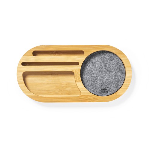 Organisateur de la ligne Nature en bambou en combinaison avec du feutre RPET. Avec fonction de support pour smartphone, plusieurs compartiments supplémentaires pour les objets et une grande zone de marquage. Avec feutre RPET distinctif et présenté dans une boîte design kraft individuelle.Le feutre RPET recyclé est le résultat de la combinaison du processus de recyclage des matières plastiques avec la technique ancienne de fabrication du feutre, résultant en un matériau éco-tendance qui, en plus d’être d’origine recyclée, devient également recyclable.