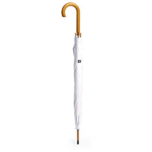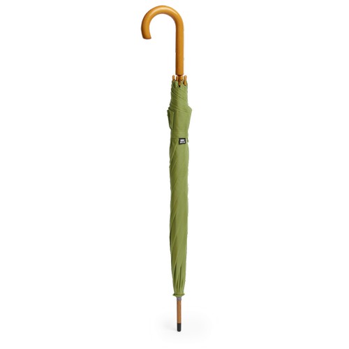 Parapluie éco-friendly de 105cm de diamètre. Fabriqué en 190T RPET (plastique recyclé) pour encourager la réutilisation des déchets plastique et contribuer à la sauvegarde de la planète. Automatique. Armatures en métal. Manche et canne en bois.