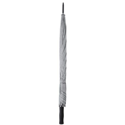 Parapluie de haute qualité de 130cm de diamètre, fabriqué en polyester 150D et dans une élégante teinte grise marbrée. Ouverture automatique, tiges de fibre de verre coupe-vent et fermeture velcro. Poignée droite en EVA. Présenté dans un sac recyclé.