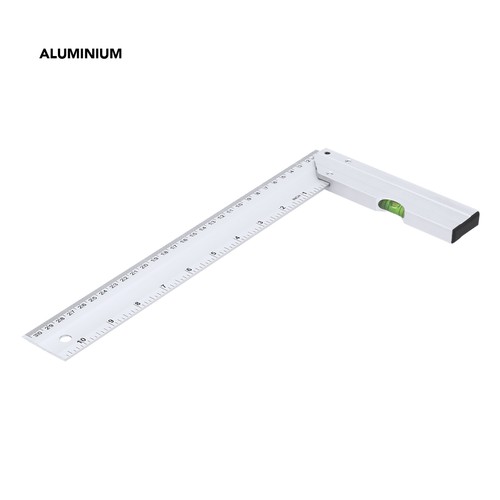 Équerre en forme de L, fabriquée en aluminium, d’une longueur de 30,5 cm et de mesures en pouces de 10,5. Conçue avec une poignée intégrant un niveau et un trou pratique pour la suspension