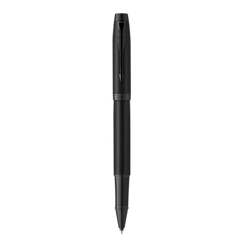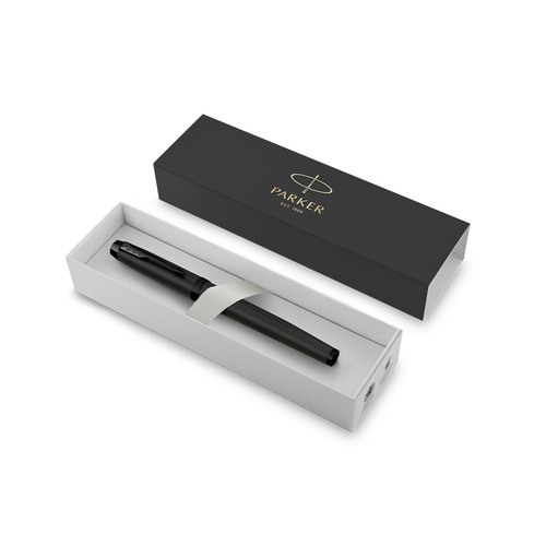 Roller Parker IM Achromatic, fabriqué en acier inoxydable avec une finition laquée noire mate et de l’encre noire. Il présente des accents noirs et le clip inimitable avec l’embout en forme de flèche emblématique de la marque sur le capuchon. Il possède un design élégant, raffiné et d’une efficacité éprouvée, complété par une silhouette moderne. Présenté dans un étui individuel noir avec le logo Parker.