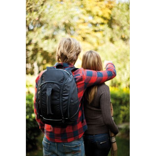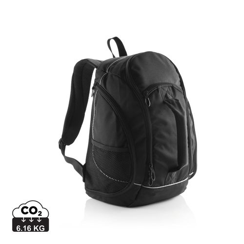 Sac à dos 600D et ripstop, 4 compartiments, pochette téléphone rembourrée, sortie écouteurs et anneau porte-clés, poignée de transport rembourrée, filet à l’arrière. Sans PVC.
