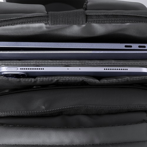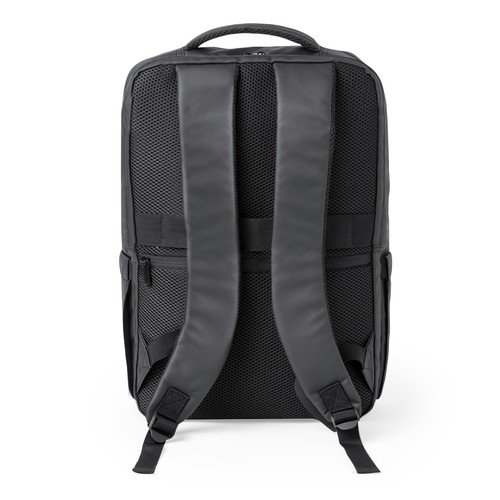 Sac à dos Antonio Miró de qualité premium en éco-cuir robuste de conception sobre en couleur noire. Avec fermeture à glissière double, poche avant et poignée renforcée rembourrée. Avec rembourrage ergonomique sur le dos et les bretelles, il comprend un compartiment intérieur rembourré pour ordinateur portable jusqu’à 15 pouces et pour tablette jusqu’à 10 pouces. De plus, une poche antivol avec fermeture à glissière à l’arrière. Étuis intérieurs pour stylos et smartphone. Avec logo de la marque sur le devant.