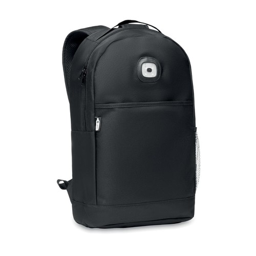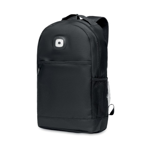 Sac à dos en RPET 600D avec lumière COB amovible à l’avant. Lampe COB de couleur blanche avec 3 réglages de luminosité différents. Poche avant avec fermeture velcro. Poche en filet sur le côté. Pile bouton incluse.