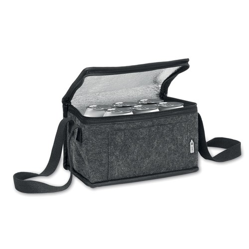Sac isotherme en feutre RPET avec poche frontale. Feutre RPET de 1 mm d’épaisseur et feuille d’aluminium laminée de 3 mm d’épaisseur. Capacité : 5 L.