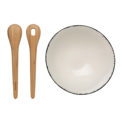 Saladier en céramique Ukiyo, couleur neutre avec un bord noir, et d’un diamètre de 27cm,. Le bol est accompagné de couverts à salade en bambou qui rendent l’ensemble complet. Le saladier passe au lave-vaisselle et au micro-ondes. Livré dans une boîte cadeau kraft.