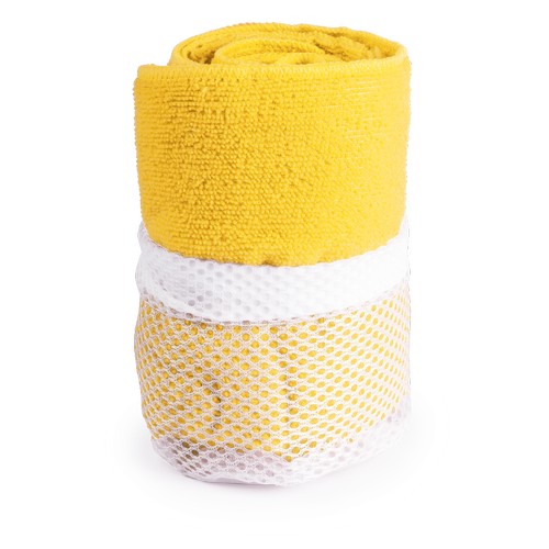 Serviette en microfibre ultra absorbante et douce en 185g/m2. Coloris variés. Dimensions 100 x 50cm. Présentée dans un sac de transport pratique en filet avec accessoire de réglage.