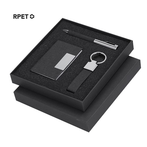 Élégant set en RPET avec finition noire bicolore et détails métalliques. Inclut:- Porte-cartes en RPET avec extérieur noir bicolore combiné et détail métallique, 1 compartiment intérieur et système de fermeture magnétique.- Stylo en RPET avec finition noire bicolore et détails métalliques. Avec mécanisme rotatif et encre bleue.- Porte-clés en RPET avec finition noire bicolore et accessoires chromés.Présenté dans une boîte individuelle noire. Inclut une carte noire intérieure avec marquage RPET.Le matériau RPET est fabriqué à partir de plastique recyclé, pour ainsi favoriser la réutilisation des déchets plastiques et aider à la durabilité de la planète.