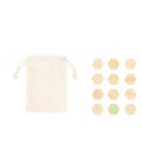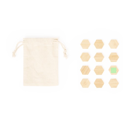 Ensemble d’aimants en bambou. Comprend 12 pièces pentagonales sculptées en bambou avec aimant pour fixer des annotations, des photos, etc., sur n’importe quelle surface métallique. Présenté dans un sac en coton. Des matériaux tels que le bambou encouragent l’utilisation de matières premières naturelles en réduisant les émissions polluantes. Il provient d’une plante très résistante et polyvalente, avec une croissance et une régénération rapides, étant une excellente alternative à l’utilisation du bois traditionnel.