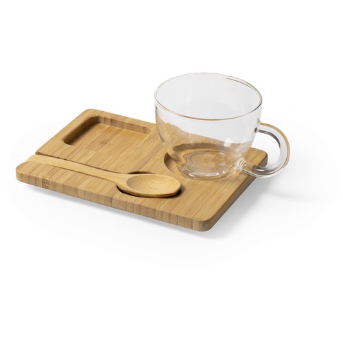 Set de la ligne nature. Il comprend un gobelet de 180 ml en verre borosilicaté, qui offre une résistance et une durabilité exceptionnelles, prolongeant sa durée de vie et pouvant être réutilisé d’innombrables fois. Base et cuillère en bambou poli, présentées dans un joli coffret design.