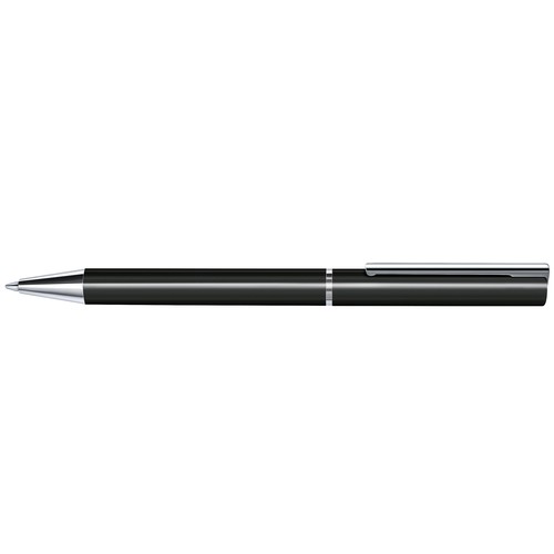 Stylo à bille à mécanisme tournant avec corps en métal laqué. Attributs en métal chromé birllant. Recharge métal super grande capacité, type G2, écriture bleue.