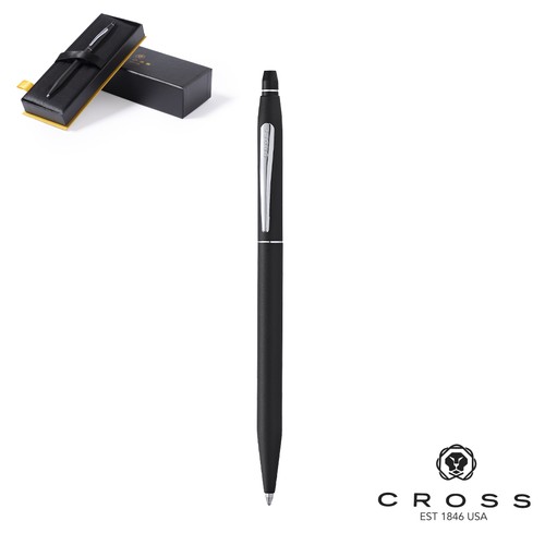 Stylo Cross Classik modèle Click, combinant la silhouette la plus iconique de Cross avec un mécanisme de clic rapide et rétractable et un corps métallique dans une touche finale doux. Cartouche jumbo à lencre noire. Présenté dans un étui noir élégant et individuel avec le logo de la marque et une doublure en doux suédine assortie.