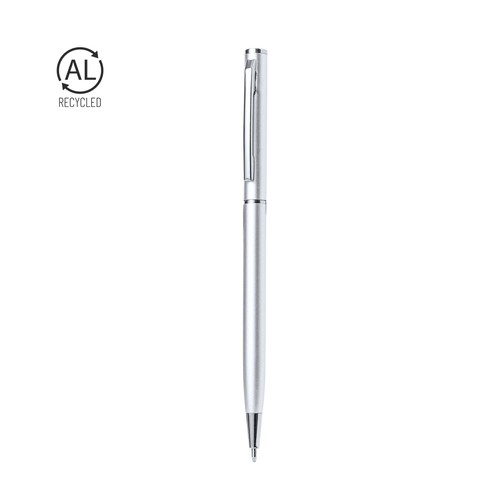 Stylo avec corps en aluminium recyclé. Clip métallique et accessoires chromés. Mécanisme rotatif et encre bleue. Avec de l’aluminium recyclé.L’aluminium recyclé est un matériau avec des possibilités de recyclage presque infinies, sans perdre ses propriétés d’origine et consommant moins d’énergie dans ce processus.Certification GRS (Global Recycled Standard / Global Recycled Recycled Standard), qui garantit l’origine recyclée du matériau utilisé pour fabriquer le produit.