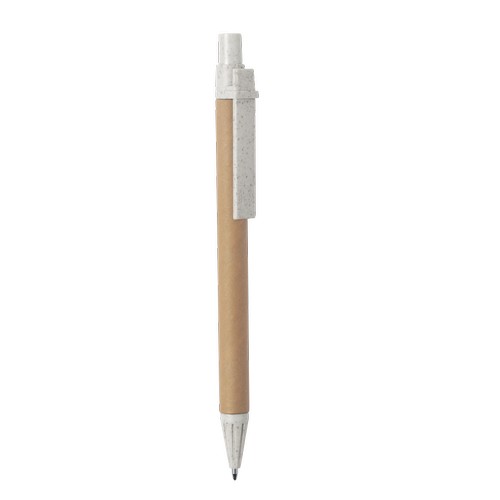 Stylo à bille avec mécanisme à cliquer de la gamme Gamme éco-friendly. corp du stylo en carton recyclé, avec accessoires en paille de blé, afin de favoriser l’utilisation de matières premières naturelles et réduire les émissions polluantes. Disponible dans une large gamme de couleurs et à l’encre bleue