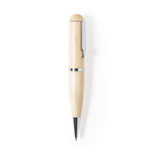Stylo à bille USB en ligne nature. Avec clé USB de 16 Go intégrée dans le capuchon et réalisée en bois, pour favoriser l’utilisation de matériaux naturels. Avec mécanisme rotatif et encre bleue. Présenté dans une jolie boîte finition kraft.
