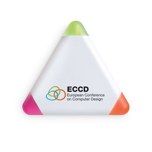 Surligneur en ABS de forme triangulaire. Trois couleurs d’encre : jaune, fuchsia et orange.