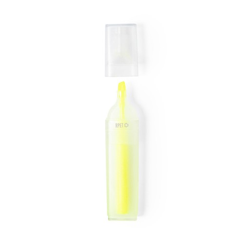 Marqueur fluorescent de la ligne Nature en RPET, fabriqué à partir de plastique recyclé pour promouvoir la réutilisation des déchets plastiques et contribuer à la durabilité de la planète. Avec corps transparent et capuche assortie. Avec badge RPET imprimé sur le marqueur.