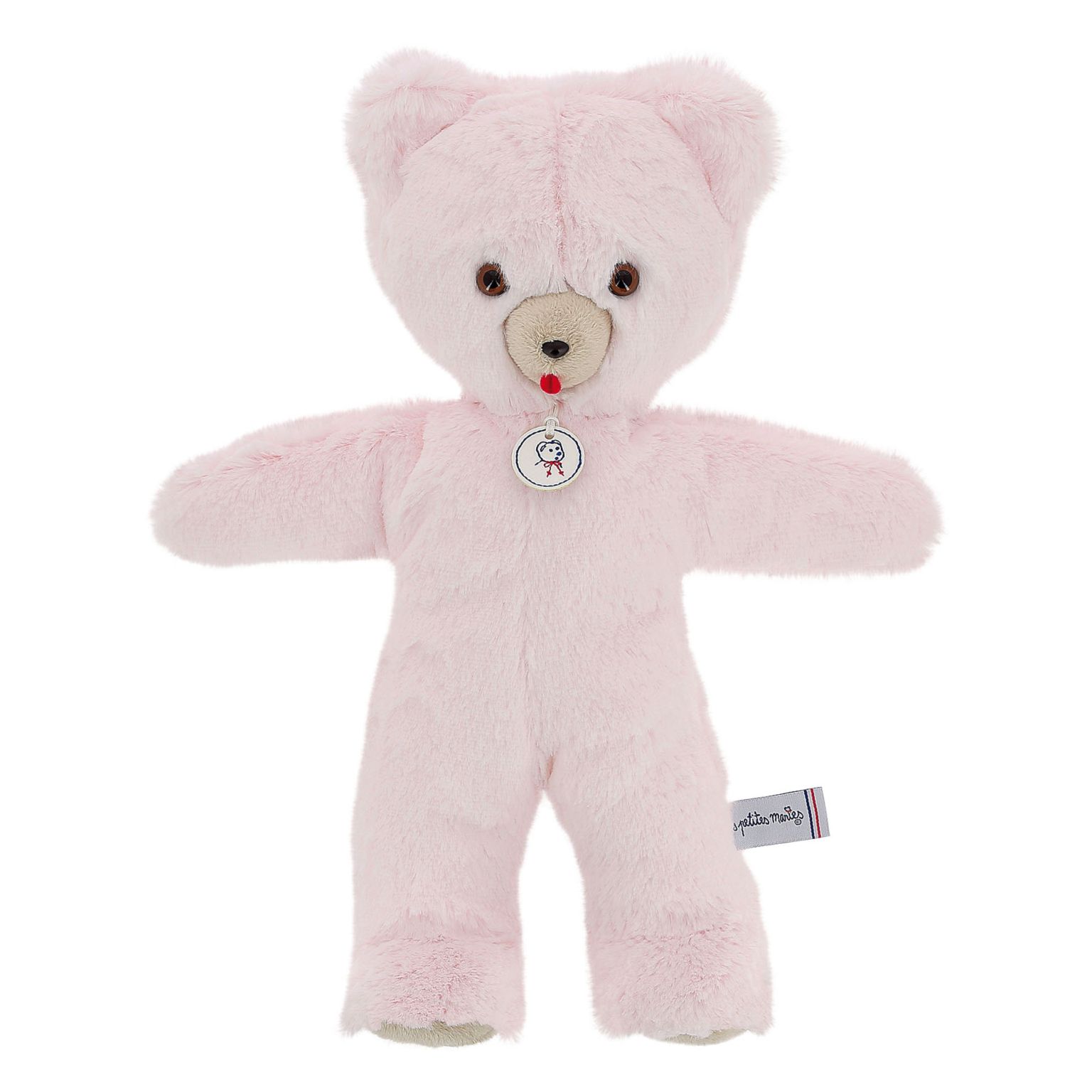 Sur son petit museau tout rond un bout de langue rouge ajoute la note colorée à la peluche.