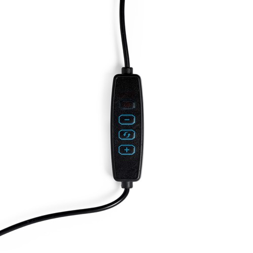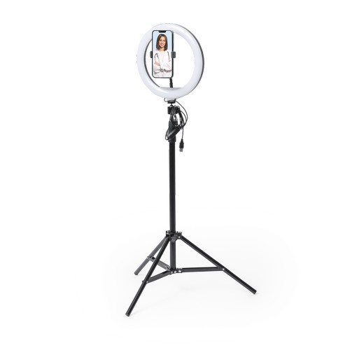 Ensemble d’éclairage. Comprend un anneau lumineux, un trépied de table et un trépied de sol avec une hauteur réglable jusqu’à 180 cm. 120 LED, avec 3 positions d’éclairage et 10 niveaux d’intensité lumineuse reglable. Alimentation via une connexion USB. Câble avec télécommande et déclencheur inclus. Présenté dans une boîte de design attrayante.