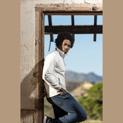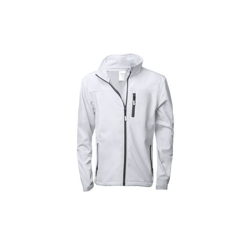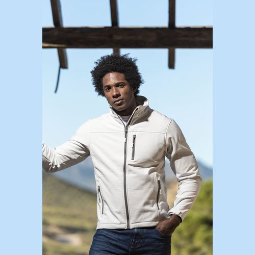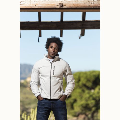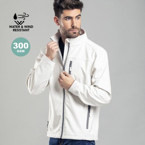 Veste imperméable et respirante en soft shell 300g/m2. Design bicolore, avec le corps en blanc et les détails en gris. Fermeture éclair pour les poches avant et latérales. Poignets réglables et disponible en tailles S, M, L, XL, XXL.