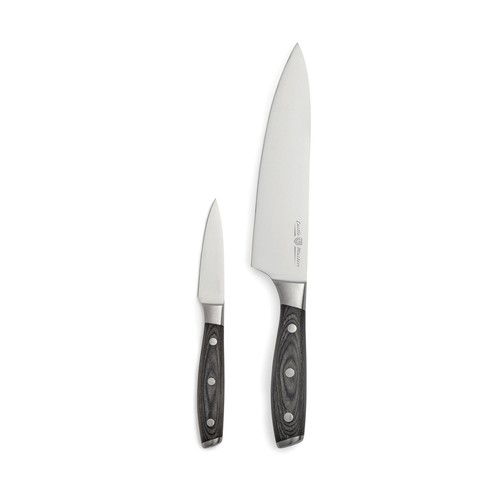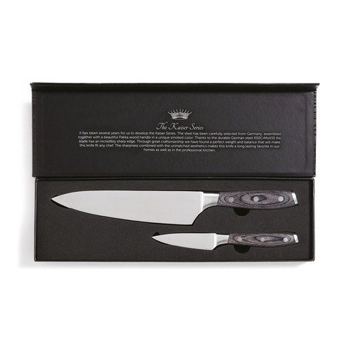 Ensemble composé d’un couteau de chef et d’un économe. Les couteaux sont fabriqués en acier allemand X50CrMoV15 avec un manche en pakkawood. Le manche facile à saisir et le superbe équilibre de la lame rendent le couteau confortable et facile à utiliser. Couteau de chef : Lame de 20 cm. Économe : Lame de 8 cm.